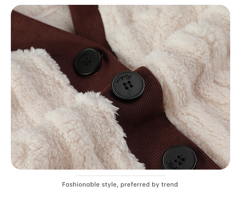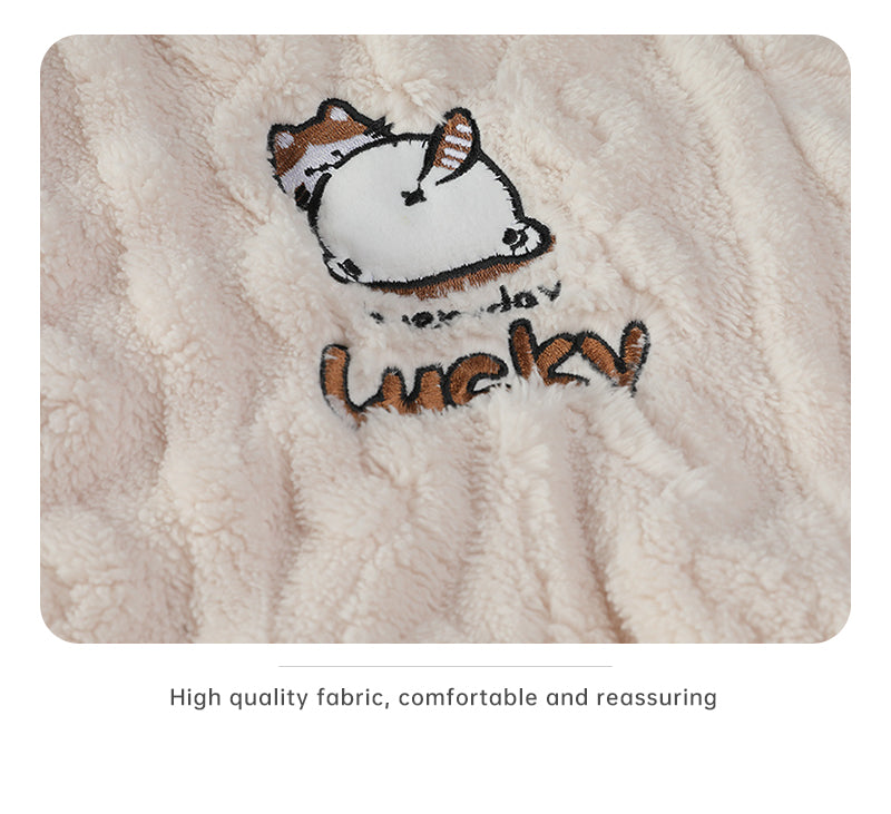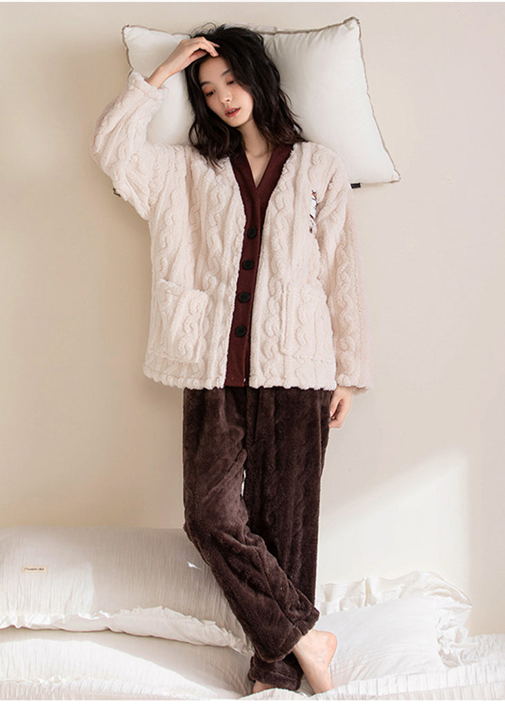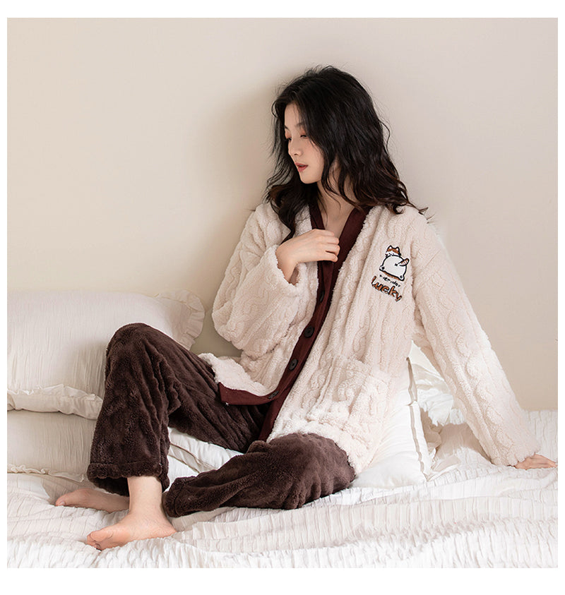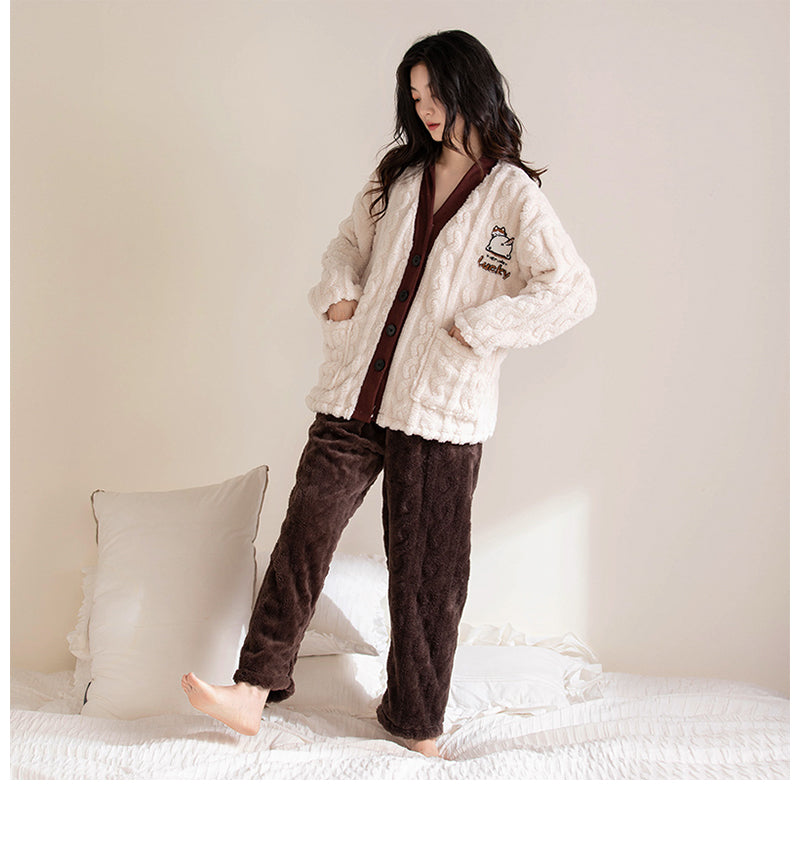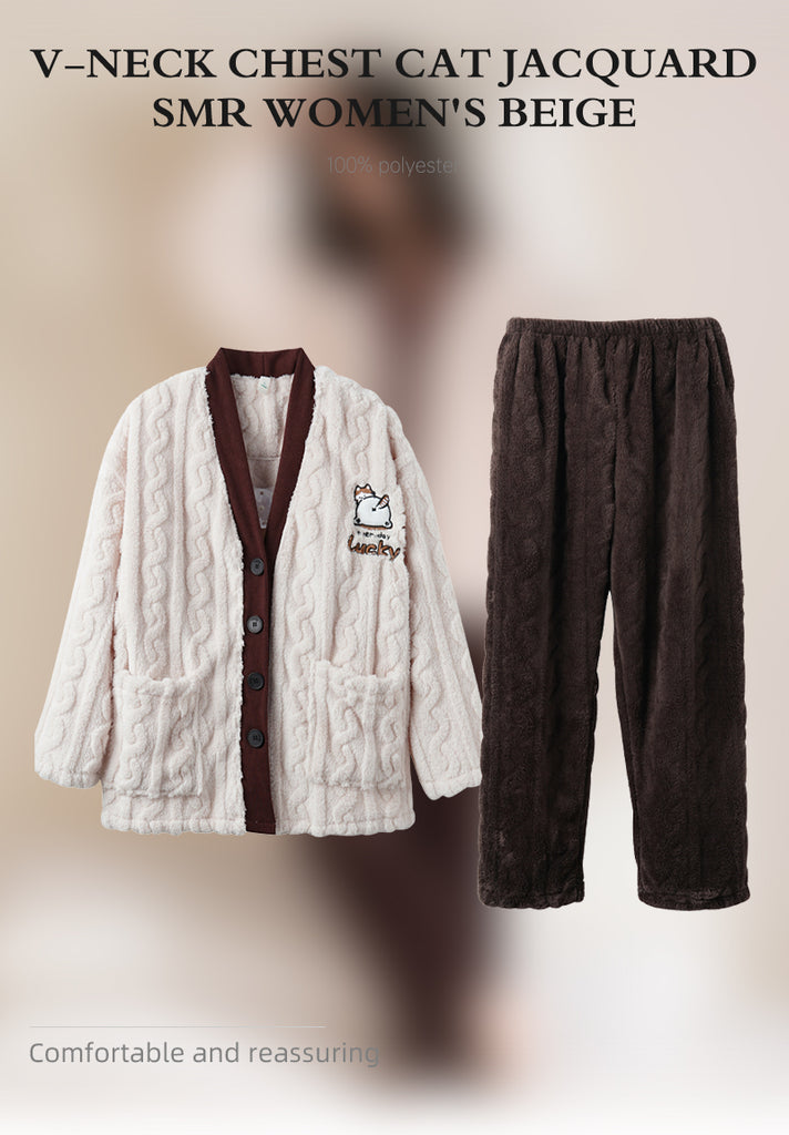 SMR female beige V-neck chest cat jacquard Coral velvet pajama set, winter warm home set